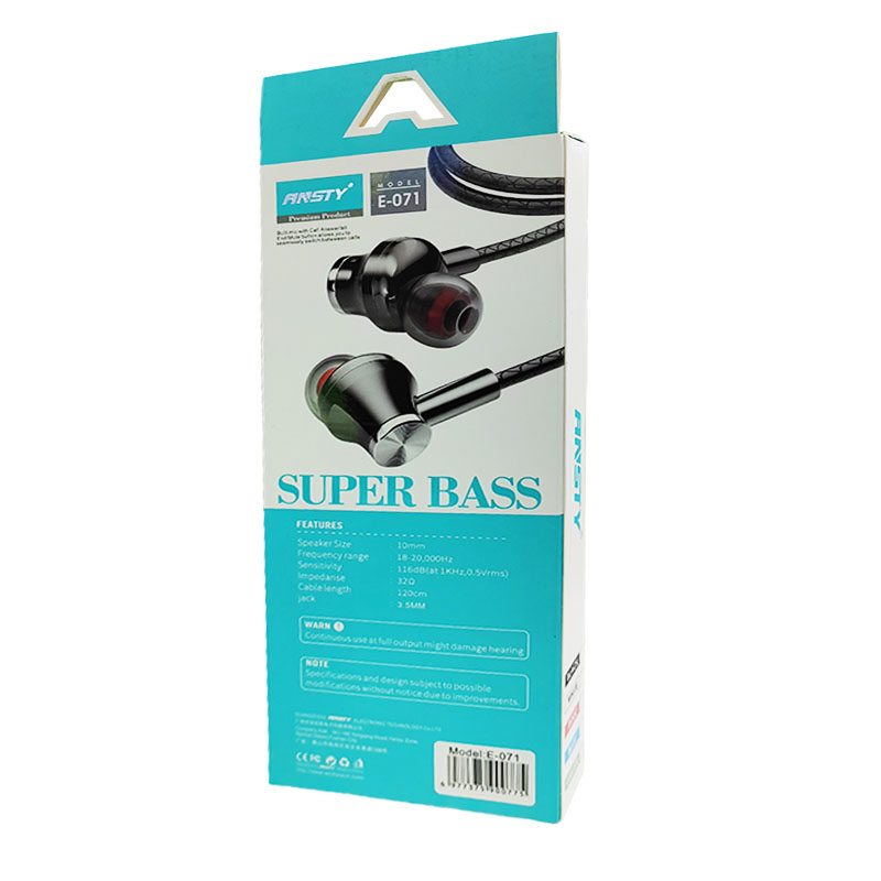 هندزفری سیمدار ANSTY E-071، تجربهای بینظیر از صدایی شفاف و بینقص! طراحی ارگونومیک و وزن سبک آن، راحتی استفاده طولانیمدت را تضمین میکند. با جک 3.5 میلیمتری سازگار با انواع دستگاهها، این هندزفری همراه همیشگی شما در موسیقی و مکالمات است. بهراحتی، کیفیت را تجربه کنید!
