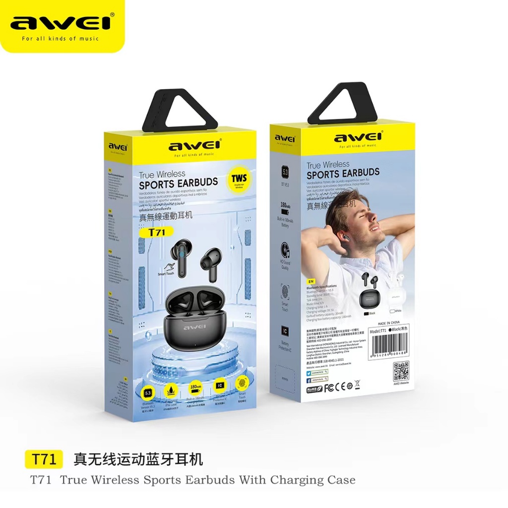 ایرباد AWEI T71 یک هدفون بیسیم کاملاً مستقل (True Wireless) است که با تمرکز روی استفاده روزمره و ورزشی طراحی شده؛ ترکیبی از قیمت اقتصادی، باتری نسبتاً قوی، و صدای قابلقبول برای کاربرانی که بهدنبال یک گزینه مقرونبهصرفه هستند، نه یک محصول کاملاً حرفهای. این مدل از بلوتوث 6 استفاده میکند، ضدآب در حد استفاده ورزشی است، و تا حدود 20 الی 25 ساعت پخش ترکیبی با کیس شارژ ارائه میدهد.