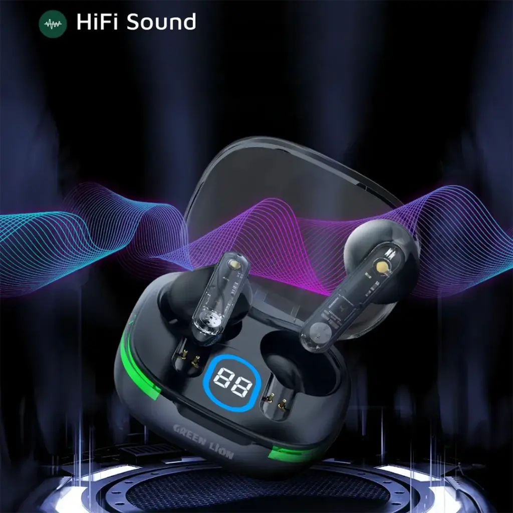ایرباد Green Lion Vegas True Wireless ترکیبی از طراحی مدرن، کیفیت صدای بالا و عملکرد هوشمند است. این مدل با رنگ مشکی مات و نورهای تنفسی (breathing lights)، جلوهای خاص و حرفهای دارد. نمایشگر دیجیتال روی کیس شارژ، وضعیت باتری را بهصورت دقیق نمایش میدهد و کنترل لمسی، استفاده از آن را ساده و سریع کرده است.