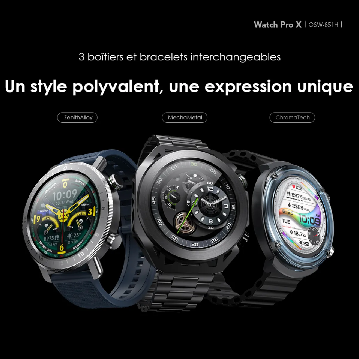 ساعت هوشمند Watch Pro X شامل مجموعه اصلی MechaMetal و ۲ مجموعه ChromaTech و ZenithAlloy اضافی رایگان است. به راحتی آن را با لباس یا حال و هوای خود هماهنگ کنید و هر بار ظاهری تازه ارائه دهید.